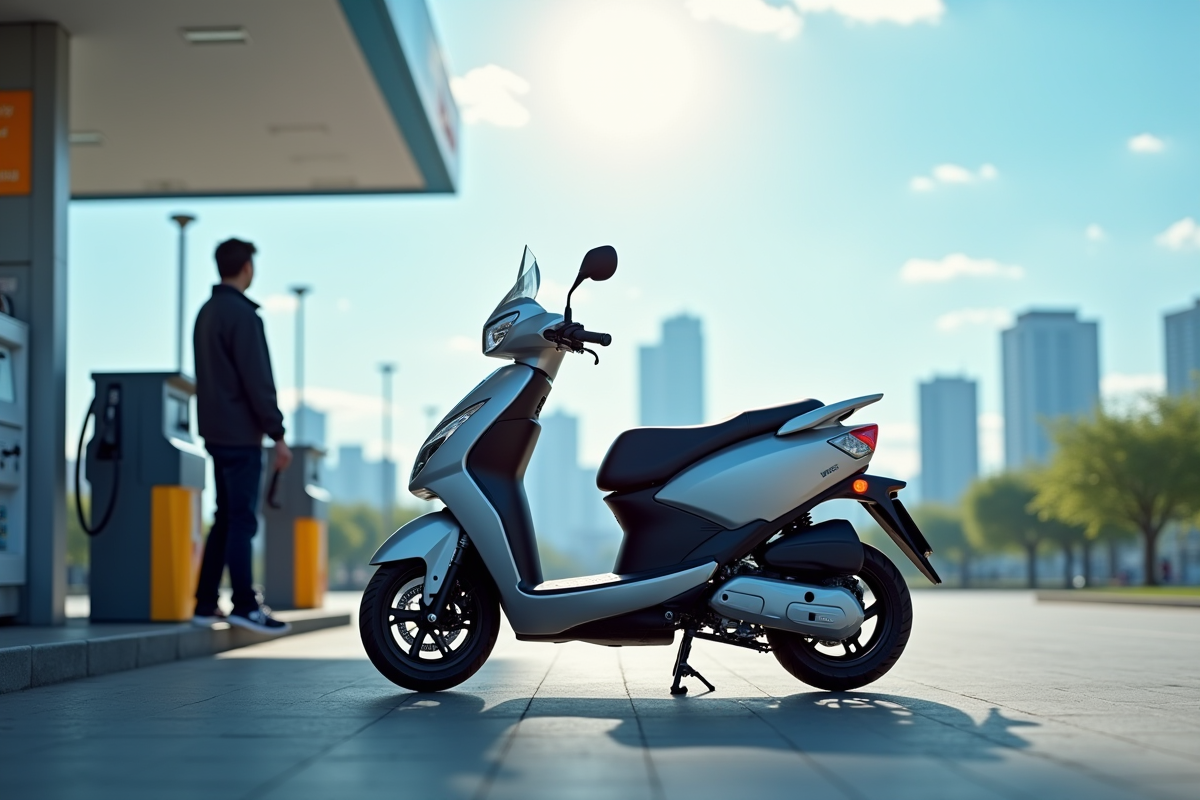 Un scooter à essence (Honda, Yamaha, Piaggio) consomme généralement entre 2,5 et 3,5 litres aux 100 km. L’autonomie dépasse facilement les 200 km, mais le prix du plein varie avec les marchés. L’entretien reste classique : vidange, courroie, bougies. Même avec la norme Euro 5, l’empreinte écologique reste sensible, surtout dans nos centres-villes.