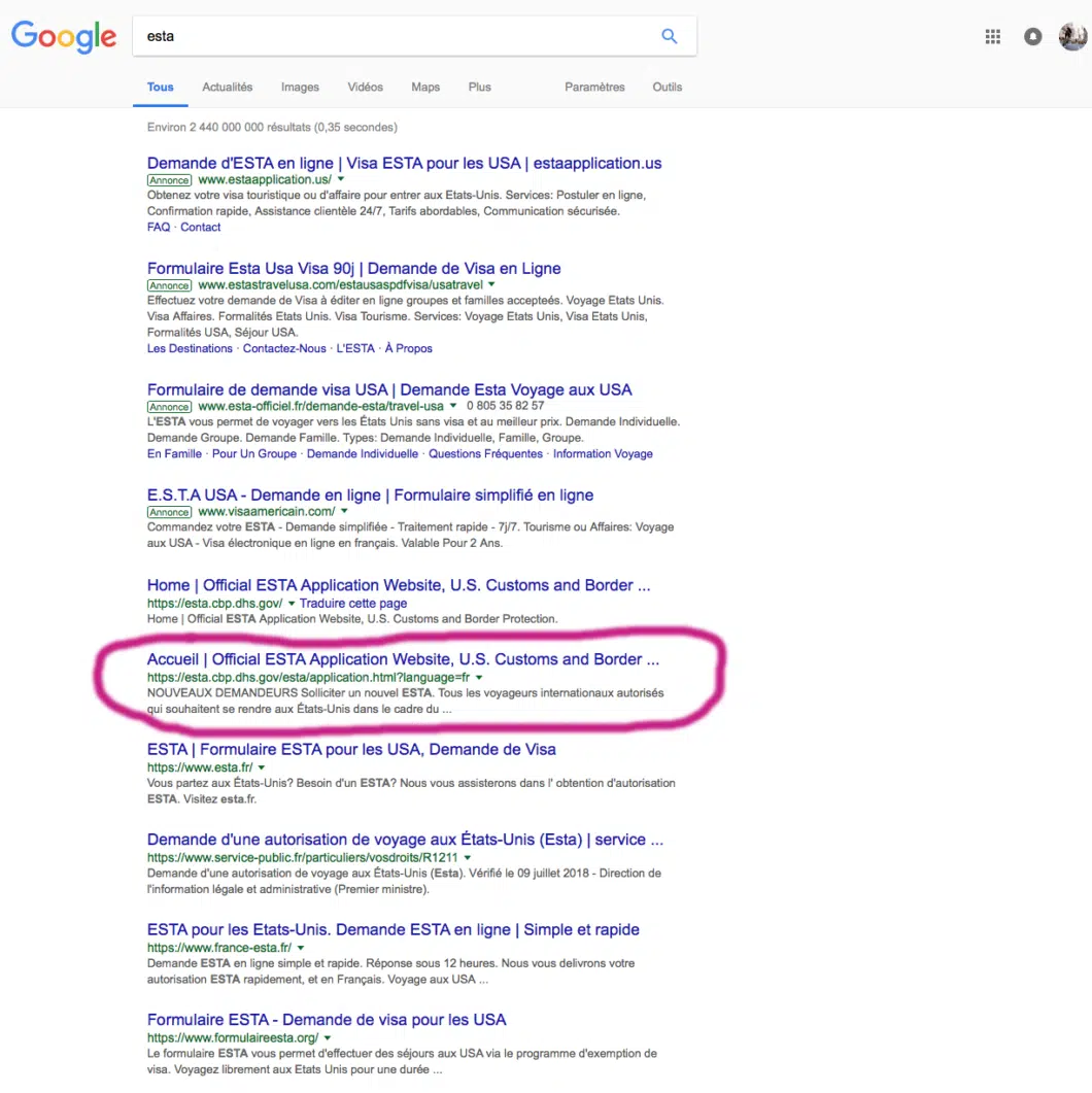 Si vous recherchez « ESTA » sur Google, vous serez surpris de voir que ce site officiel n’apparaît pas en premier dans la liste… Il est donc nécessaire d’être vigilant et ne sautez pas sur le premier site est venu, sous peine d’avoir une certaine déception …