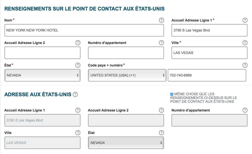 Entrez simplement l’adresse du premier hôtel ou Airbnb dans lequel vous séjournerez dans ce champ, que vous changiez d’établissement tous les soirs. Une autre question se pose souvent : « Je fais un road trip là-bas et je serai dans un endroit différent tous les soirs, que dois-je remplir dans ? » Vous avez besoin d’une adresse. Tout ce que vous avez à faire est de vérifier la croix ci-dessous afin que le champ « adresse sur place » soit rempli avec les mêmes coordonnées.
